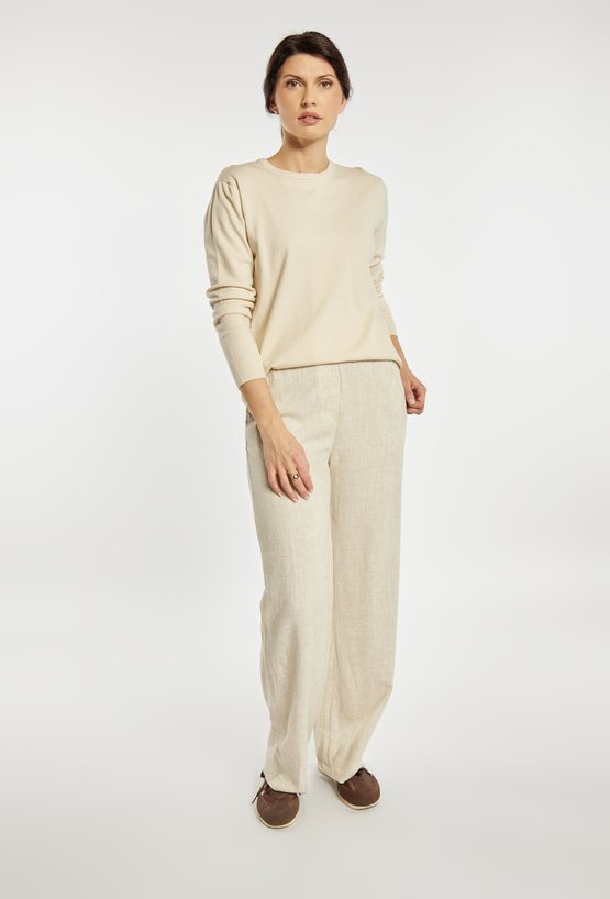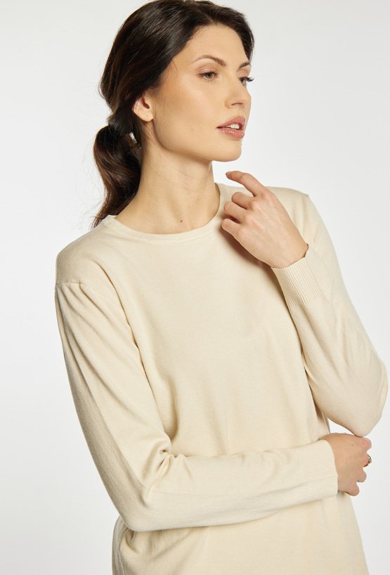 Stylowy sweter damski o klasycznym kroju z długim rękawem. Model z okrągłym dekoltem oraz minimalistycznym designem, który sprawdzi się w wielu stylizacjach. Sweter zapewnia komfort noszenia i doskonale pasuje do codziennych oraz eleganckich zestawów. Modelka na zdjęciu ma 177 cm wzrostu i prezentuje rozmiar S/M.
