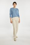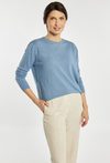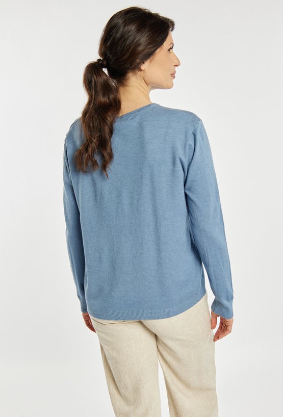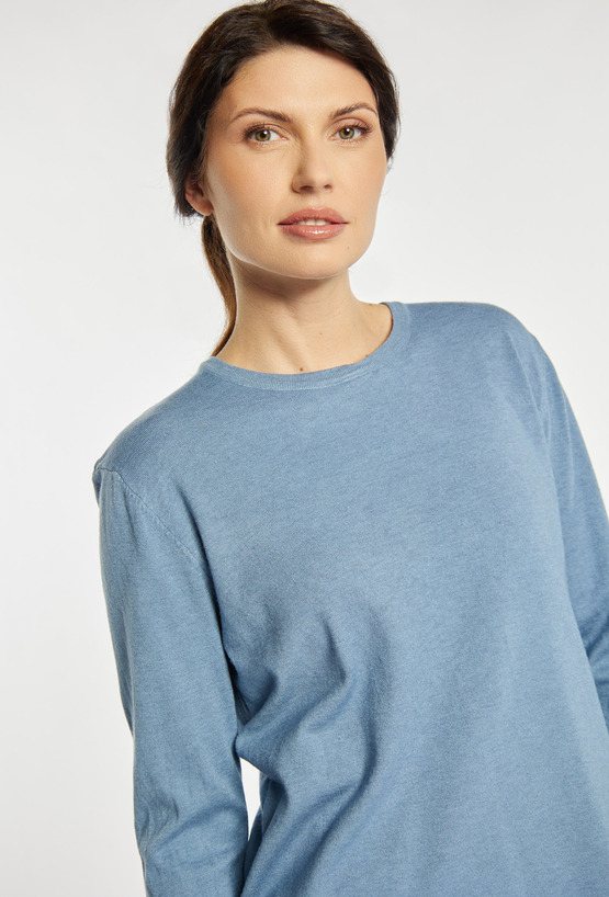 Stylowy sweter damski o klasycznym kroju z długim rękawem. Model z okrągłym dekoltem oraz minimalistycznym designem, który sprawdzi się w wielu stylizacjach. Sweter zapewnia komfort noszenia i doskonale pasuje do codziennych oraz eleganckich zestawów. Modelka na zdjęciu ma 177 cm wzrostu i prezentuje rozmiar S/M.