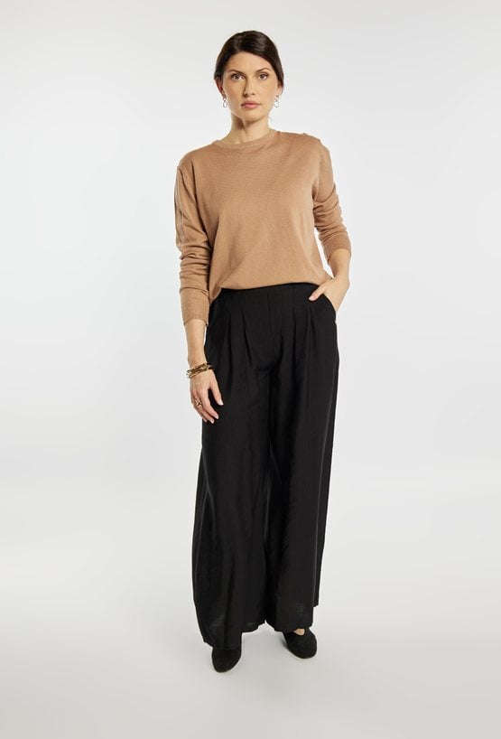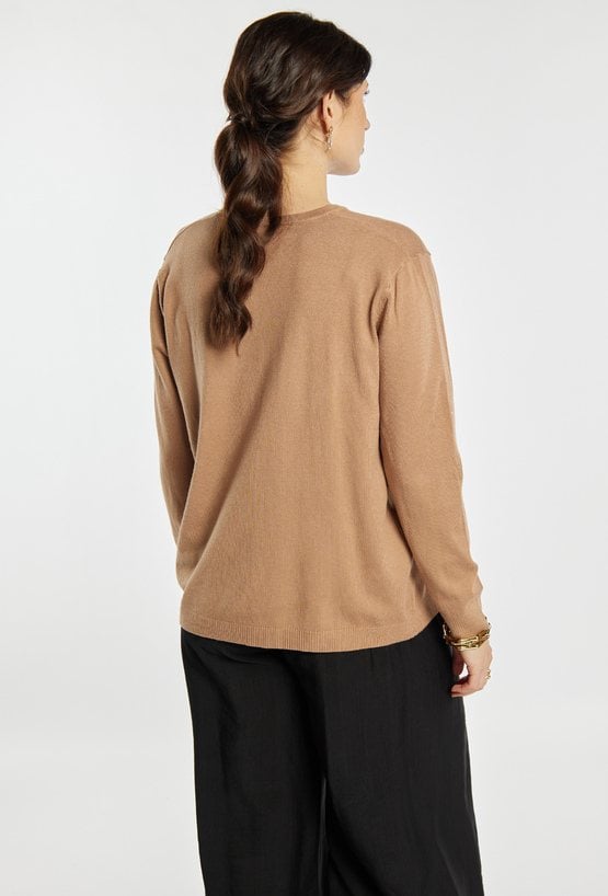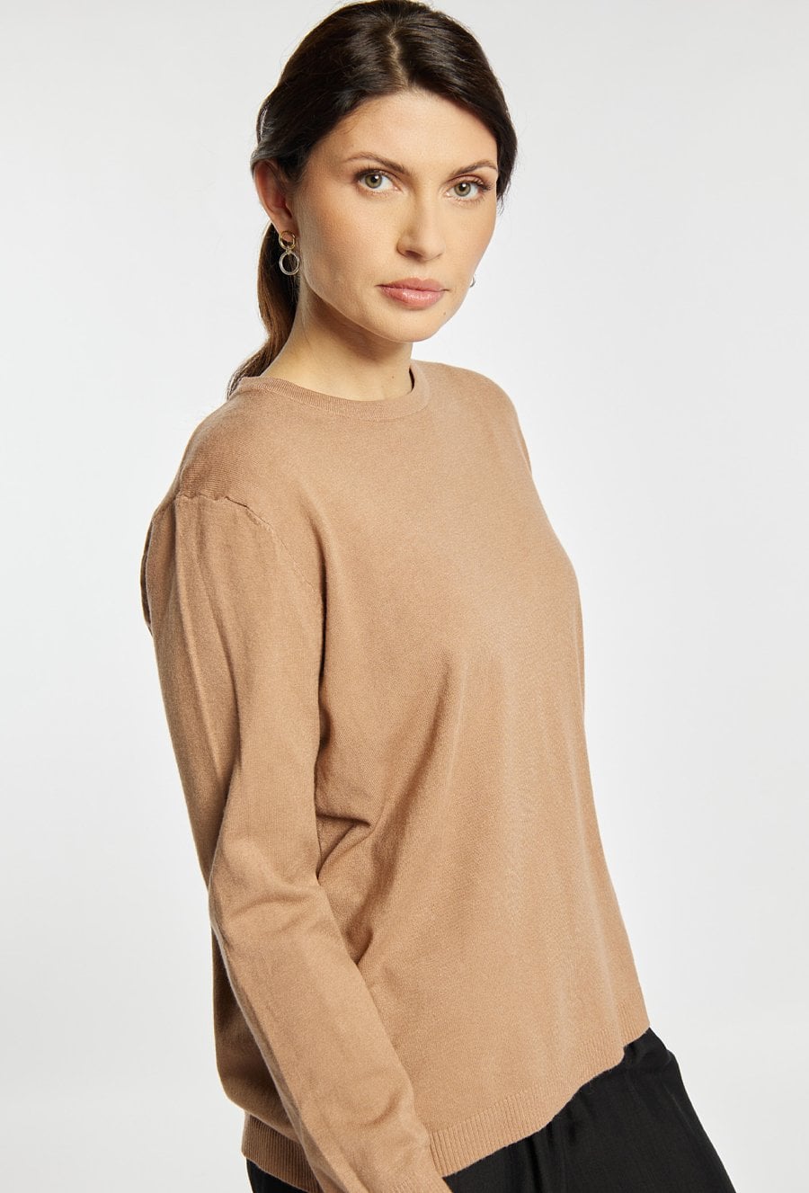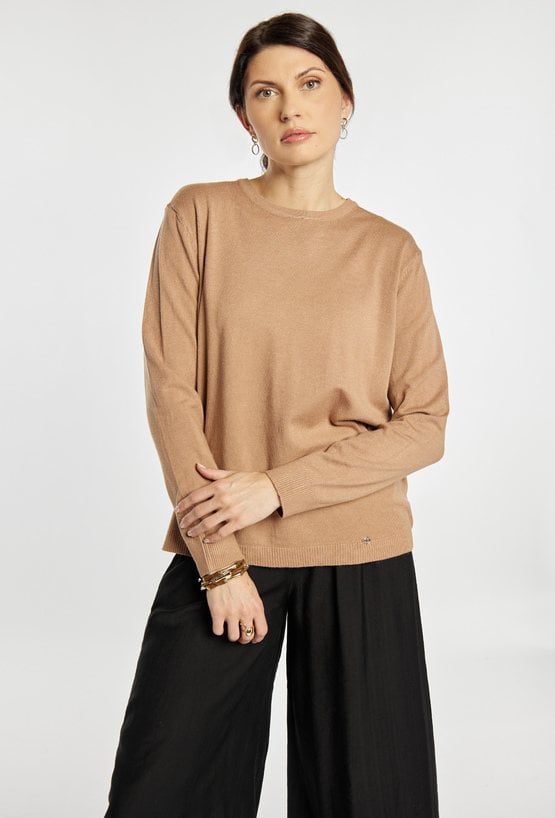 Stylowy sweter damski o klasycznym kroju z długim rękawem. Model z okrągłym dekoltem oraz minimalistycznym designem, który sprawdzi się w wielu stylizacjach. Sweter zapewnia komfort noszenia i doskonale pasuje do codziennych oraz eleganckich zestawów. Modelka na zdjęciu ma 177 cm wzrostu i prezentuje rozmiar S/M.