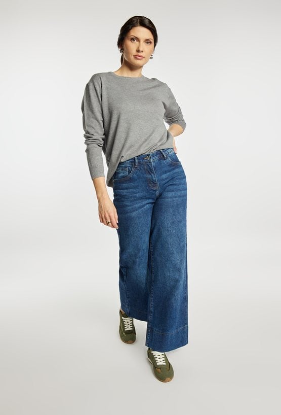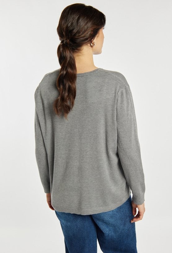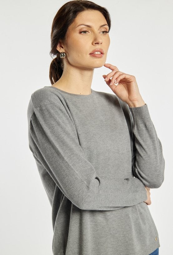 Stylowy sweter damski o klasycznym kroju z długim rękawem. Model z okrągłym dekoltem oraz minimalistycznym designem, który sprawdzi się w wielu stylizacjach. Sweter zapewnia komfort noszenia i doskonale pasuje do codziennych oraz eleganckich zestawów. Modelka na zdjęciu ma 177 cm wzrostu i prezentuje rozmiar S/M.