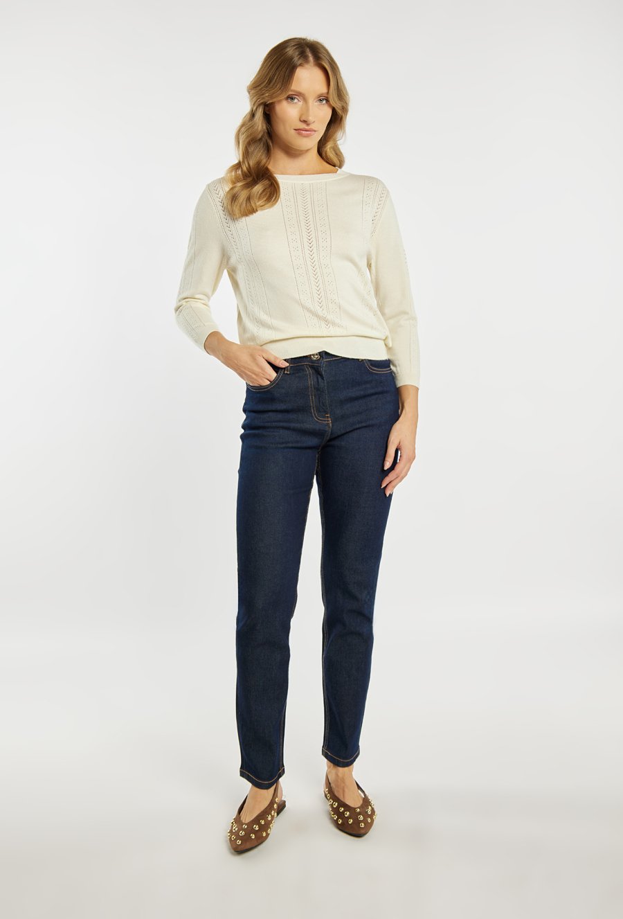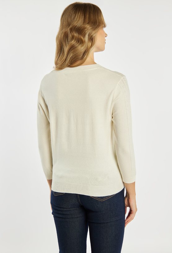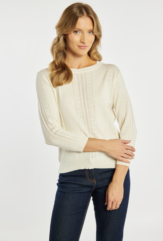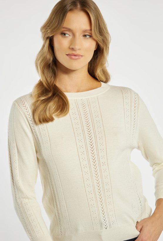 Sweter damski o klasycznym, eleganckim kroju. Model z długim rękawem oraz półokrągłym dekoltem. Przód zdobi subtelny, ażurowy wzór w pionowe pasy, który nadaje całości lekkości i kobiecego charakteru. Damski sweter doskonale sprawdzi się w codziennych oraz bardziej eleganckich stylizacjach. Modelka na zdjęciu ma 177 cm wzrostu i prezentuje rozmiar S/M.
