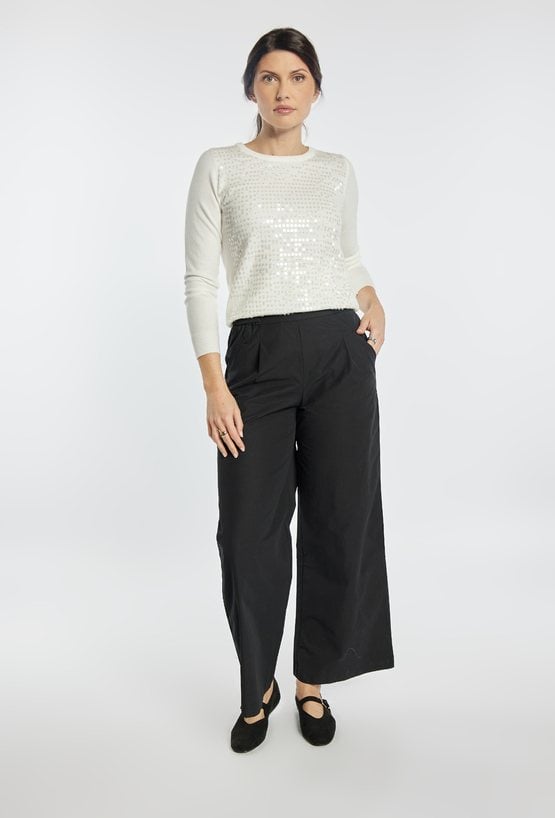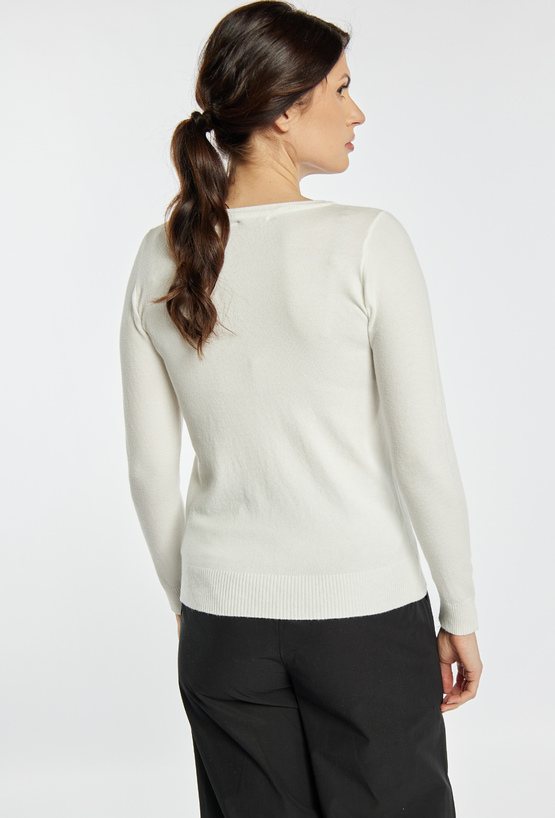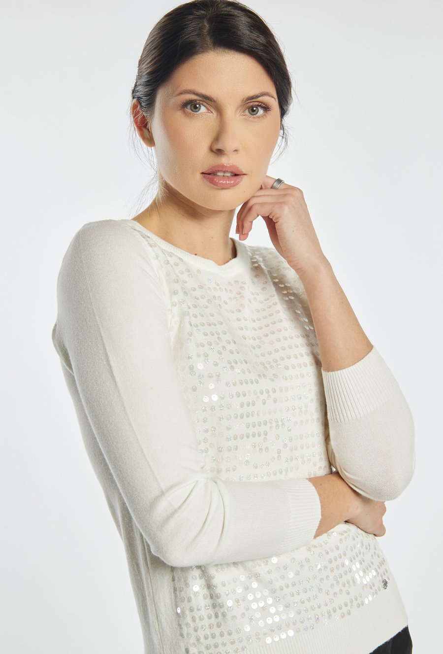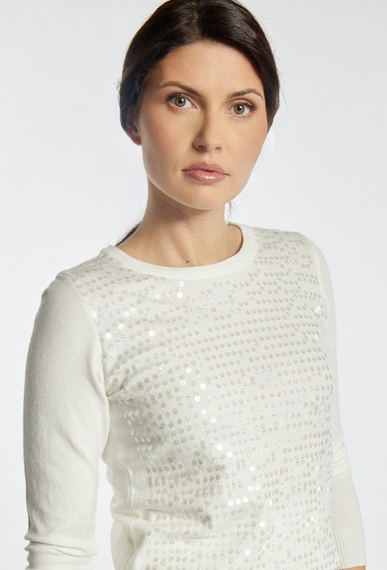 Sweter damski o dopasowanym, eleganckim kroju. Model z długim rękawem oraz klasycznym, zaokrąglonym dekoltem. Przód zdobi efektowna aplikacja z połyskujących cekinów, która nadaje całości wyjątkowego i kobiecego charakteru. Damski sweter doskonale sprawdzi się zarówno w codziennych, jak i bardziej eleganckich stylizacjach. Modelka na zdjęciu ma 177 cm wzrostu i prezentuje rozmiar S/M.