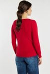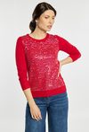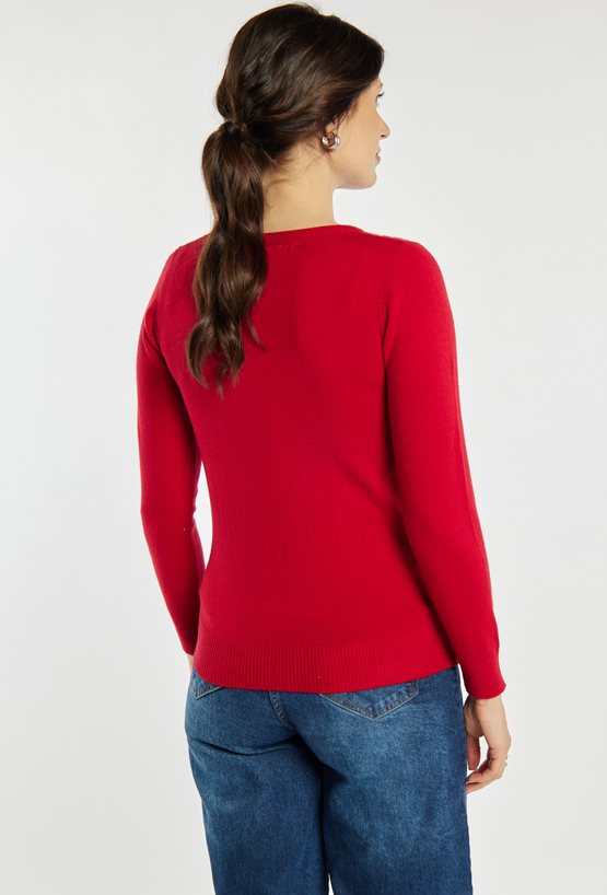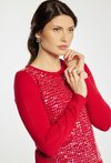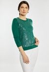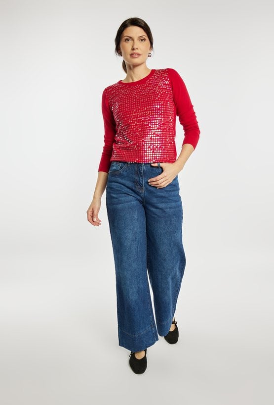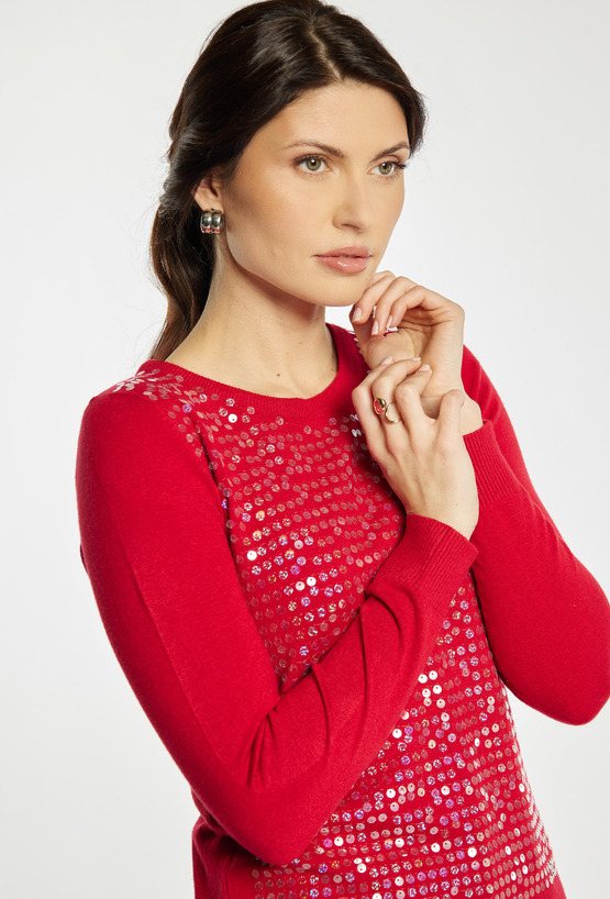 Sweter damski o dopasowanym, eleganckim kroju. Model z długim rękawem oraz klasycznym, zaokrąglonym dekoltem. Przód zdobi efektowna aplikacja z połyskujących cekinów, która nadaje całości wyjątkowego i kobiecego charakteru. Damski sweter doskonale sprawdzi się zarówno w codziennych, jak i bardziej eleganckich stylizacjach. Modelka na zdjęciu ma 177 cm wzrostu i prezentuje rozmiar S/M.