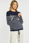 Sweter damski o swobodnym, casualowym kroju. Model z długim rękawem oraz półokrągłym dekoltem. Całość zdobi poziomy wzór w paski oraz dekoracyjny napis na przodzie, który nadaje stylizacji modnego charakteru. Dół swetra wykończony ściągaczem z wiązaniem, co pozwala na regulację i dopasowanie do sylwetki. Sweter doskonale sprawdzi się w codziennych stylizacjach. Modelka na zdjęciu ma 177 cm wzrostu i prezentuje rozmiar S/M.