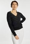 Sweter damski o eleganckim, kobiecym kroju. Model z długim rękawem oraz dekoltem w kształcie litery V, który subtelnie podkreśla linię szyi. Przód ozdobiony jest efektowną aplikacją z drobnych, połyskujących koralików. Damski sweter doskonale sprawdzi się zarówno w codziennych, jak i bardziej eleganckich stylizacjach. Modelka na zdjęciu ma S/M.