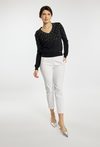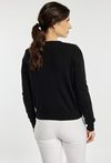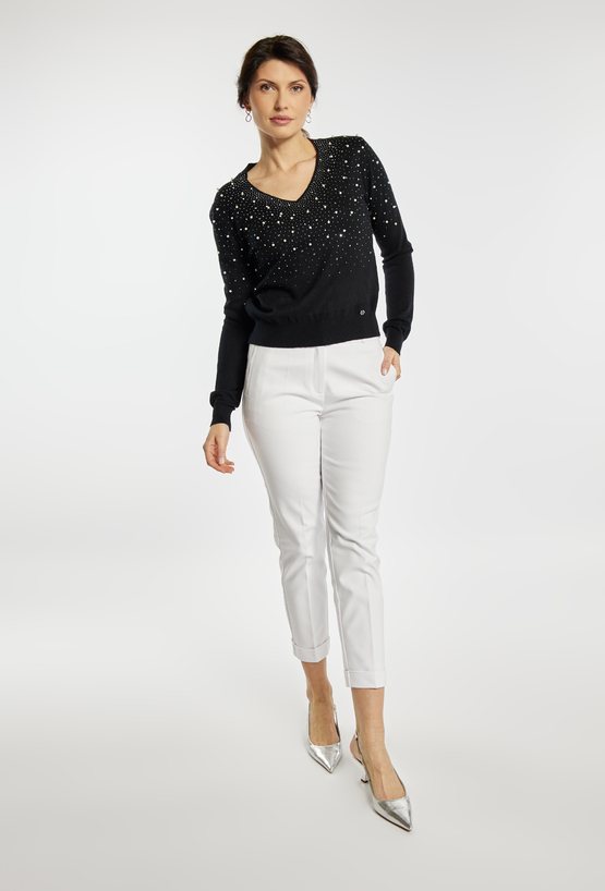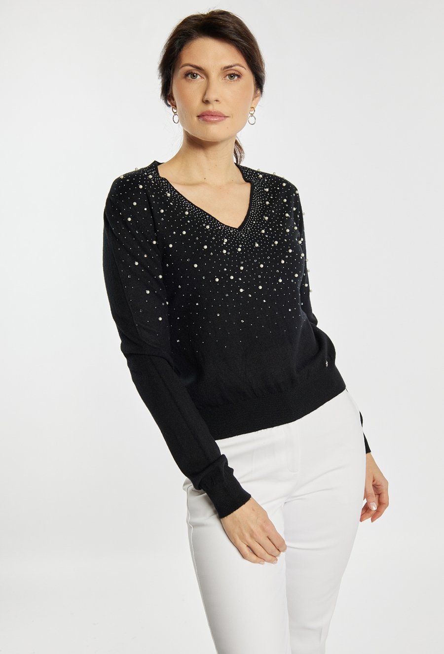 Sweter damski o eleganckim, kobiecym kroju. Model z długim rękawem oraz dekoltem w kształcie litery V, który subtelnie podkreśla linię szyi. Przód ozdobiony jest efektowną aplikacją z drobnych, połyskujących koralików. Damski sweter doskonale sprawdzi się zarówno w codziennych, jak i bardziej eleganckich stylizacjach. Modelka na zdjęciu ma S/M.