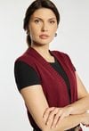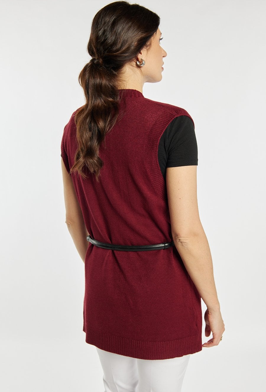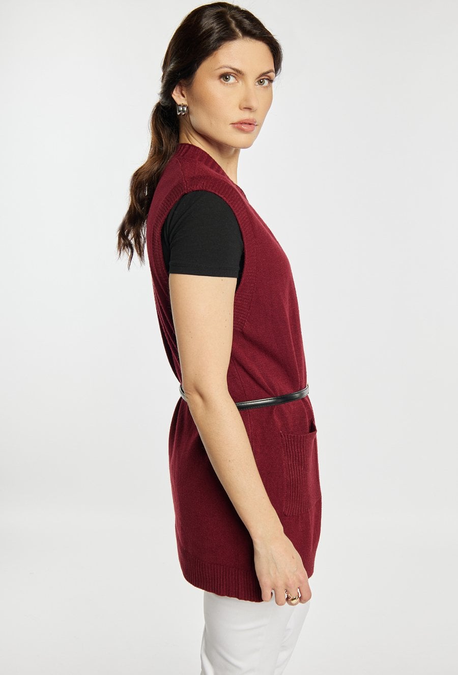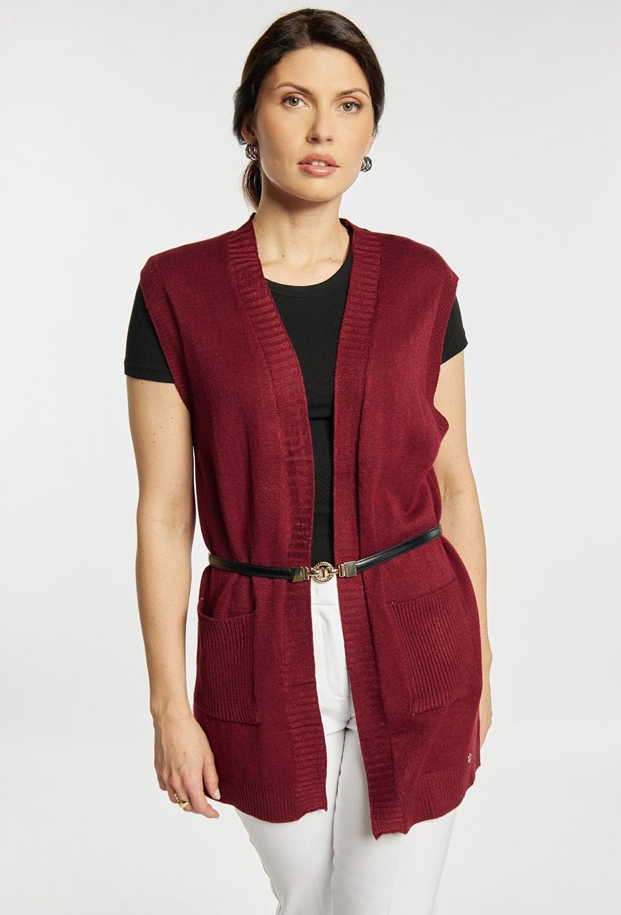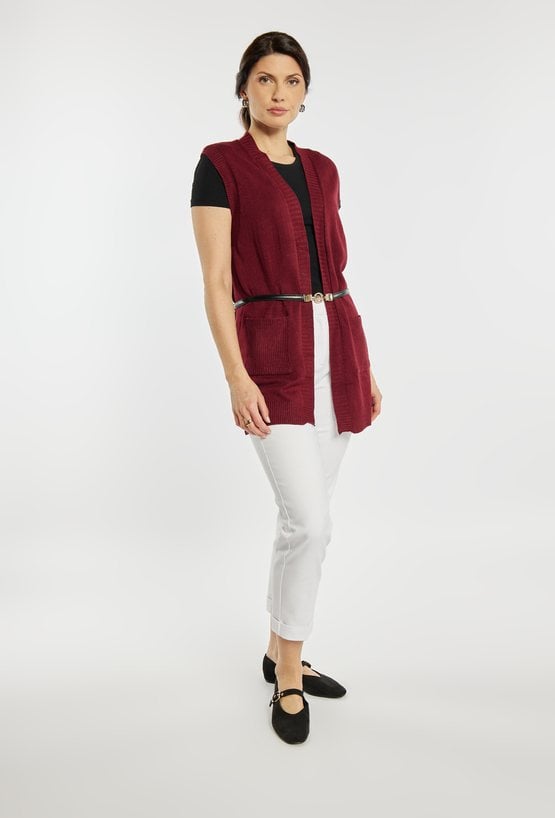 Kardigan damski o luźnym kroju bez rękawów. Model otwarty, z praktycznymi kieszeniami oraz subtelnym, minimalistycznym wykończeniem. Kardigan doskonale sprawdzi się jako warstwowy element stylizacji, zapewniając komfort i modny wygląd w codziennych oraz eleganckich zestawach. Modelka na zdjęciu ma 177 cm wzrostu i prezentuje rozmiar S/M. Pasek widoczny na zdjęciu nie jest elementem swetra.