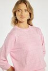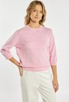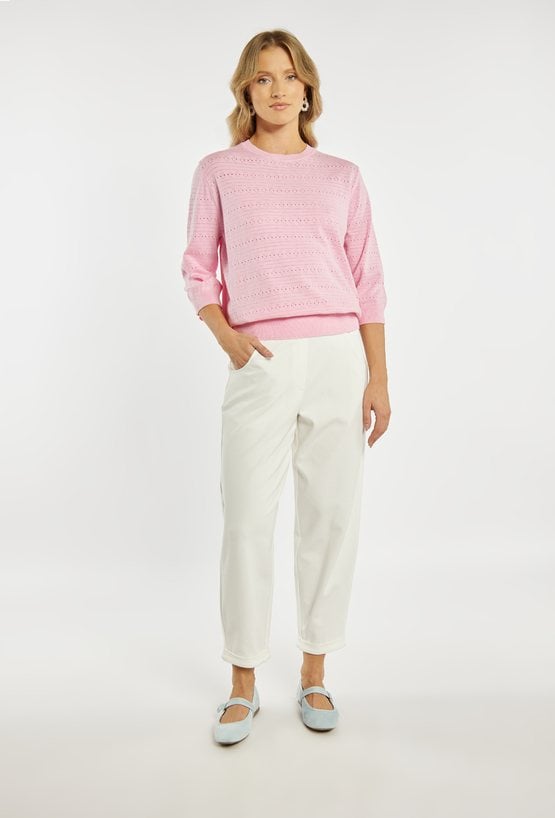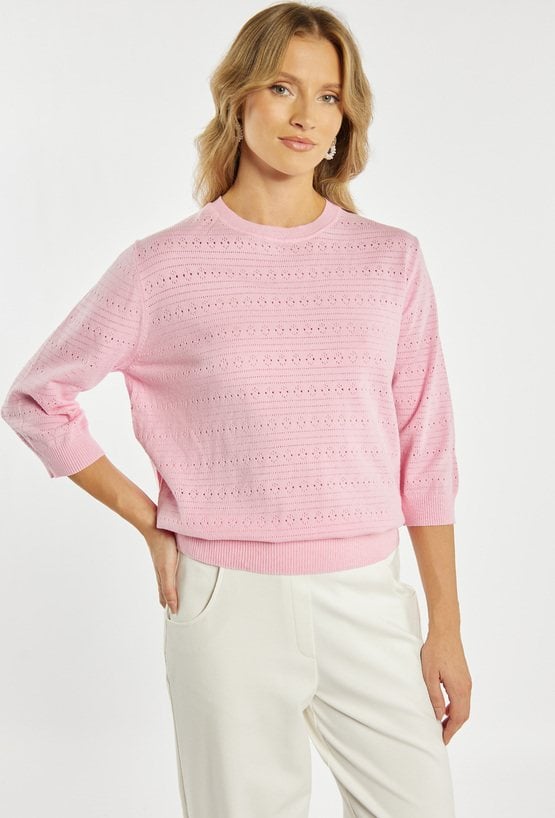 Sweter damski o klasycznym, uniwersalnym kroju. Model z długim rękawem oraz półokrągłym dekoltem. Ażurowy splot w subtelne, poziome wzory nadaje całości lekkości i eleganckiego charakteru. Damski sweter doskonale sprawdzi się w codziennych oraz bardziej stylowych stylizacjach. Modelka na zdjęciu ma 177 cm wzrostu i prezentuje rozmiar S/M.