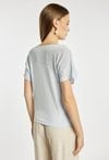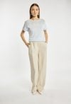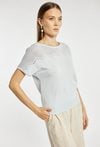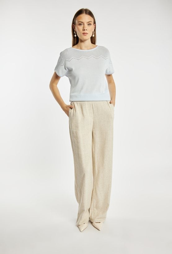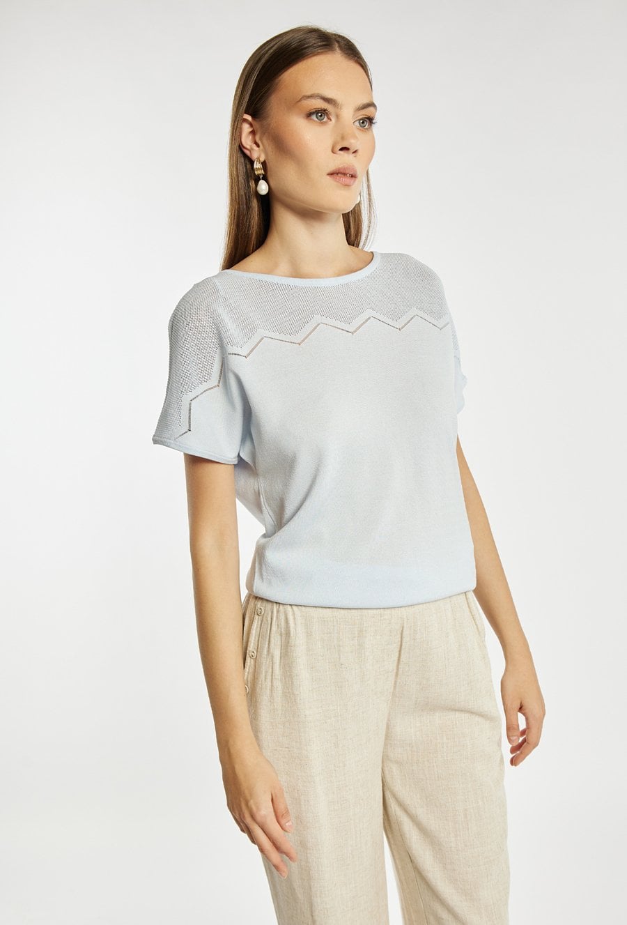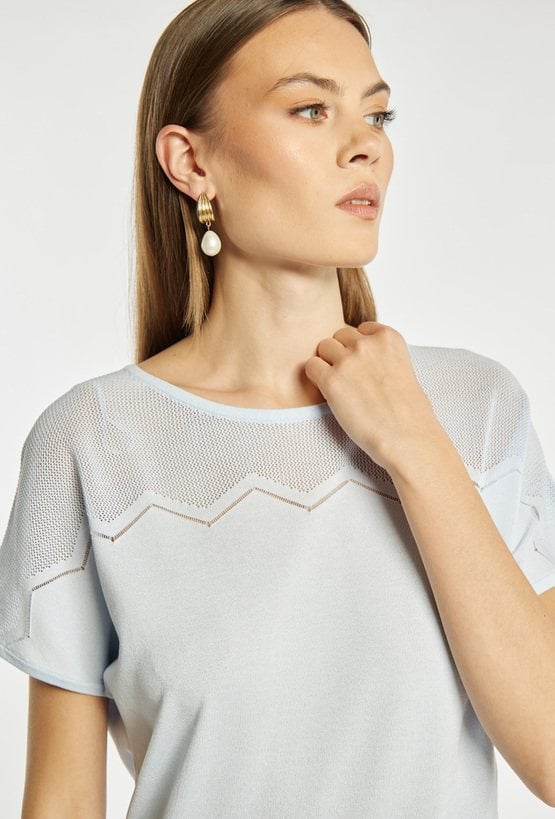Sweter damski o prostym, klasycznym kroju. Model z krótkim rękawem oraz okrągłym dekoltem, ozdobiony subtelnym, geometrycznym wzorem w górnej części. Sweter świetnie sprawdzi się w codziennych stylizacjach, zarówno w zestawieniu ze spodniami, jak i spódnicą. Modelka na zdjęciu ma 177 cm wzrostu i prezentuje rozmiar S.
