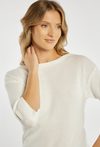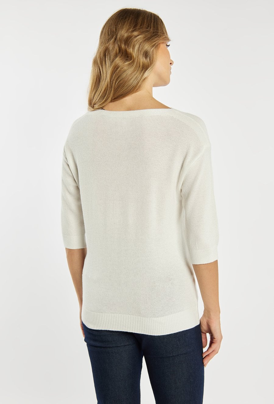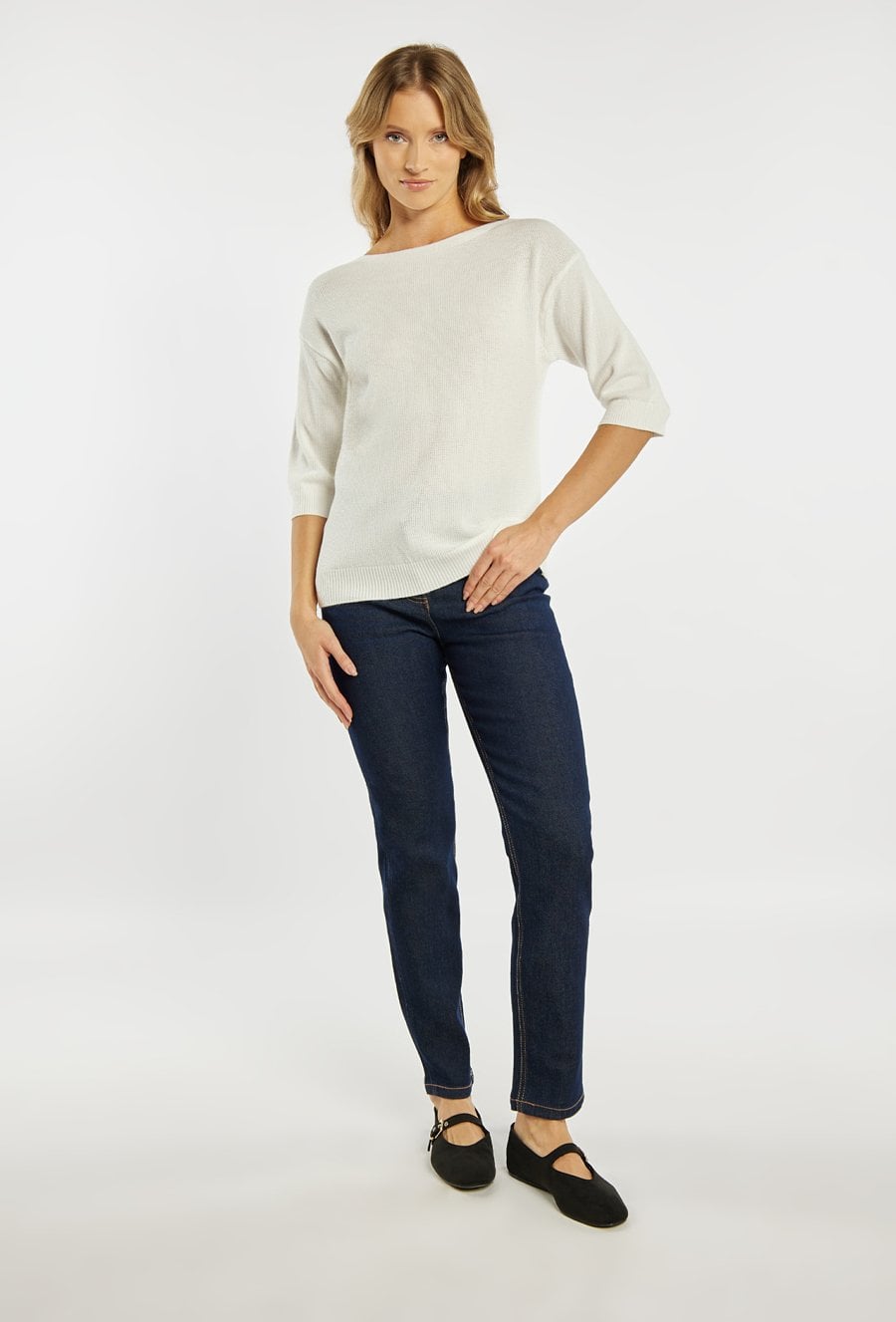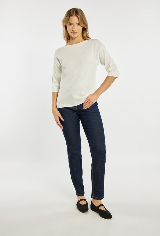 Sweter damski o klasycznym, minimalistycznym kroju. Model z rękawem o długości 3/4 oraz delikatnym, łódkowym dekoltem, który subtelnie podkreśla linię ramion. Damski sweter basic doskonale sprawdzi się w codziennych oraz bardziej eleganckich stylizacjach. Modelka na zdjęciu ma 177 cm wzrostu i prezentuje rozmiar S/M.