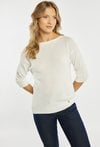 Sweter damski o klasycznym, minimalistycznym kroju. Model z rękawem o długości 3/4 oraz delikatnym, łódkowym dekoltem, który subtelnie podkreśla linię ramion. Damski sweter basic doskonale sprawdzi się w codziennych oraz bardziej eleganckich stylizacjach. Modelka na zdjęciu ma 177 cm wzrostu i prezentuje rozmiar S/M.