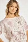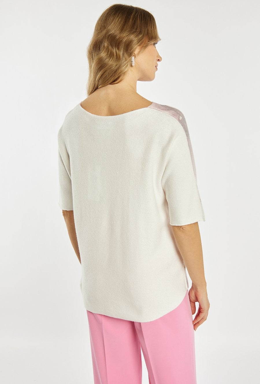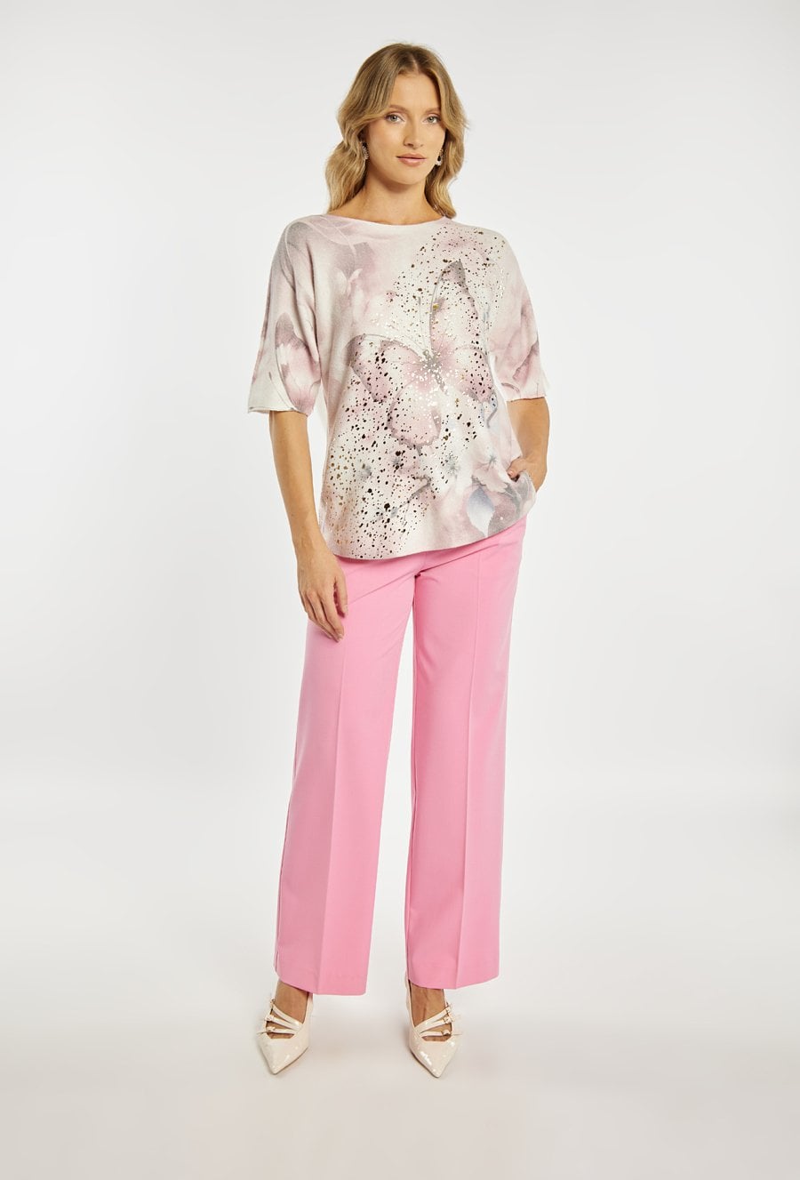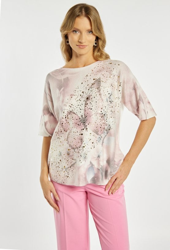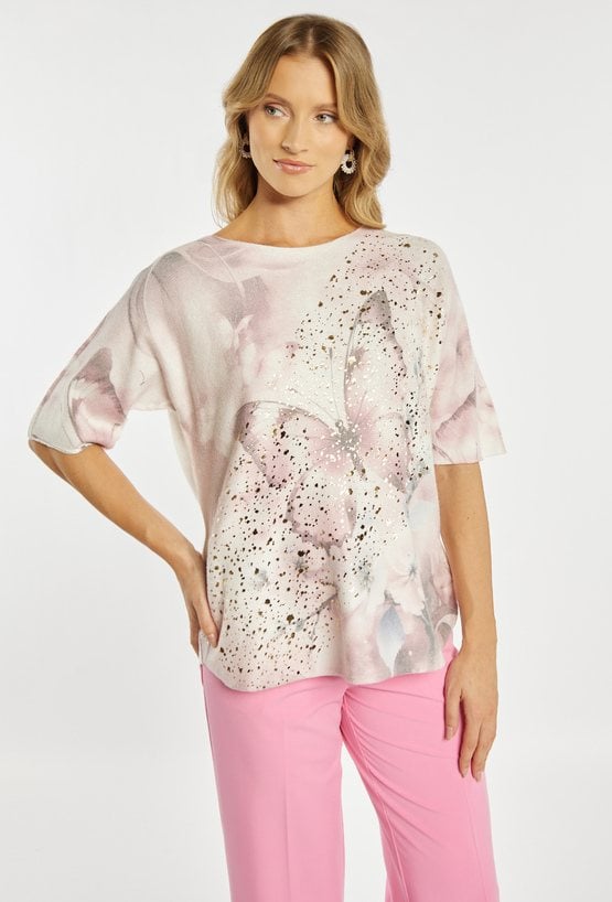 Sweter o swobodnym, komfortowym kroju. Model z krótkim rękawem oraz klasycznym, zaokrąglonym dekoltem. Przód zdobi efektowny nadruk z motywem motyla i kwiatów, uzupełniony subtelnymi, złotymi akcentami, które nadają całości eleganckiego i kobiecego charakteru. Sweter świetnie sprawdzi się w codziennych stylizacjach. Modelka na zdjęciu ma 177 cm wzrostu i prezentuje rozmiar S/M.